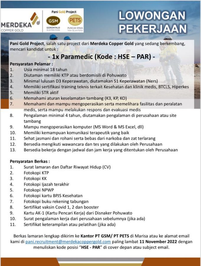 POHUWATO (barometernewsgo.com)-Perusahaan tambang emas PT Merdeka Copper Gold Tbk melalui Pani Gold Project (PGP), membuka lowongan pekerjaan bagi lulusan D3 dan S1 Keperawataan (Ners).