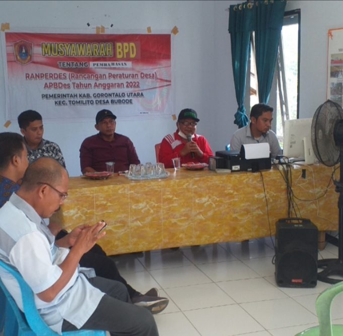 GORUT (barometernewsgo.com)-Camat Tomilito Kab. Gorontalo Utara, Rizal Modanggu, Sabtu (8/1) melakukan kunjungan kerja ke Desa Bubode guna menghadiri Rapat Pembahasan Rancangan Peraturan Desa (Ranperdes) Tahun Anggaran 2022 yang dipusatkan di Gedung Pemdes Bubode.
