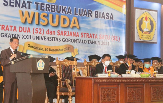 LIMBOTO (barometernewsgo.com)- Bupati Gorontalo memberikan orasi ilimiah kepada Wisuda Sarjana Magister (S2) dan Sarjana Strata Satu (S1) angkatan XXII Gelombang ke-II Universitas Gorontalo (UG) Tahun 2021, di gedung UGCC Universitas Gorontalo Kamis, (30/12/21).
