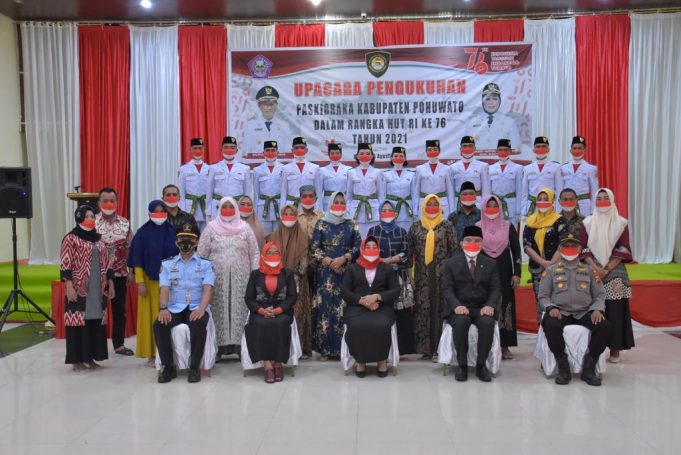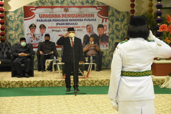 KABGOR (barometernewsgo.com) - Berlangsung di pelataran Rumah Dinas Bupati, Wakil Bupati Kabupaten Gorontalo, Hendra Hemeto, resmi mengukuhkan Pasukan Pengibar Bendera Pusaka Kabupaten Gorontalo untuk bertugas pada upacara Hari Ulang Tahun Kemerdekaan RI ke 76, Ahad (15/8/2021).