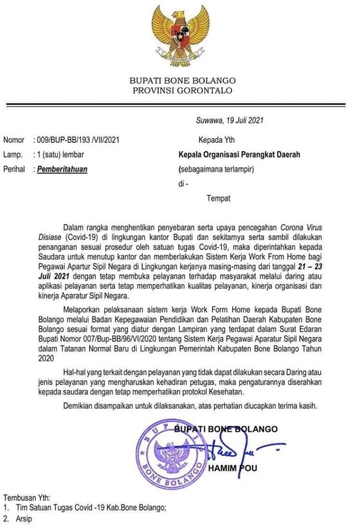 BONEBOL (barometernewsgo.com) - Bupati Bone Bolango, Hamim Pou, mengeluarkan Surat Pemberitahuan (SP) penutupan sementara aktivitas Kantor Bupati Bone Bolango mulai dari tanggal 21-23 Juli 2021.