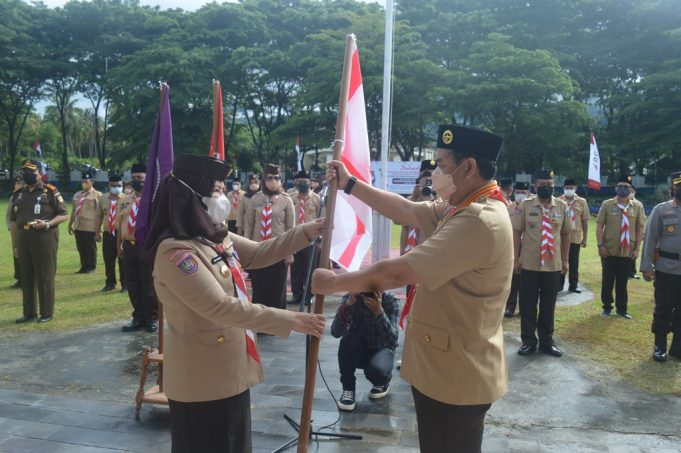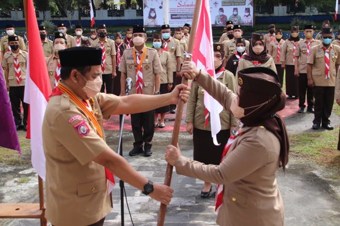 BONEBOL (barometernewsgo.com) - Ketua Kwartir Cabang (Kwarcab) Gerakan Pramuka Bone Bolango periode 2021-2026, Lolly Pou Yunus, resmi dilantik oleh Ketua Majelis Pembimbing Cabang (Mabicab) Bone Bolango, Hamim Pou, di halaman Kantor Bupati Bone Bolango, Rabu, (14/7/2021).