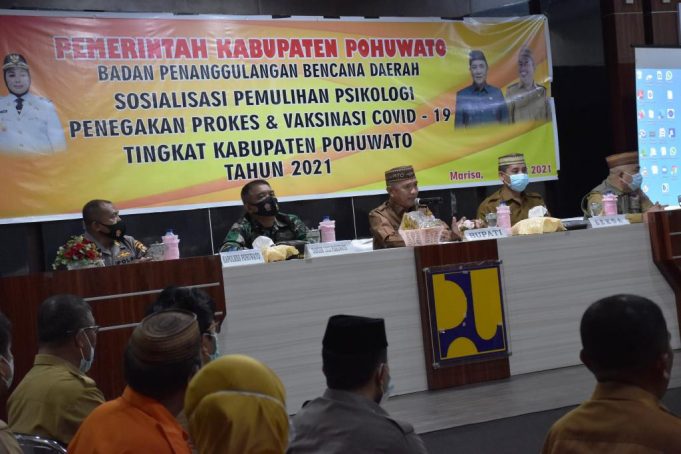 POHUWATO (barometernewsgo.com)-Bupati Pohuwato Saipul Mbuinga membuka kegiatan sosialisasi pemulihan psikologi, penegakan protokol kesehatan dan vaksinasi Covid-19 yang diselenggarakan BPBD Pohuwato di aula Dinas Pekerjaan Umum.
