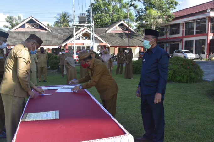 BOALEMO DAMAI (barometernewsgo.com)-Plt Bupati Boalemo Anas Jusuf menyaksikan penandatanganan pakta integritas pimpinan OPD di lingkungan Pemerintah Kabupaten Boalemo di halaman kantor Bupati, Senin (11/1).