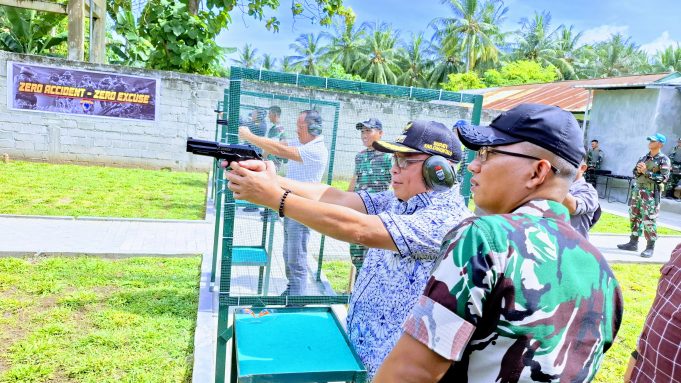 KABGOR (barometernewsgo.com)-Bupati Kab. Gorontalo Sofyan Puhi bersama unsur Forum Komunikasi Pimpinan Daerah (Forkopimda) (Kabupaten Gorontalo malakukan latihan menembak di Yonif 713/Satyatama Telaga Biru, Sabtu (10/05/2025).