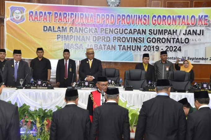DPRD PROVINSI GORONTALO (barometernewsgo.com)- Empat orang pimpinan DPRD Provinsi Gorontalo masa bakti 2019 - 2024 dilantik dan diambil sumpahnya. Pengambilan sumpah jabatan dilakukan oleh Ketua Pengadilan Tinggi Gorontalo dalam Ruangan Rapat Gedung DPRD Provinsi Gorontalo, Senin,...