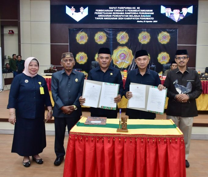 POHUWATO (barometernewsgo.com)-Bupati Pohuwato Saipul A. Mbuinga menghadiri Rapat Paripurna ke-65 Pembicaraa Tingkat II Penandatanganan Persetujuan Bersama Ranperda Perubahan Anggaran Pendapatan Belanja Daerah (APBD) Tahun Anggaran 2024 di Ruang Sidang DPRD, Jumat (23/8).