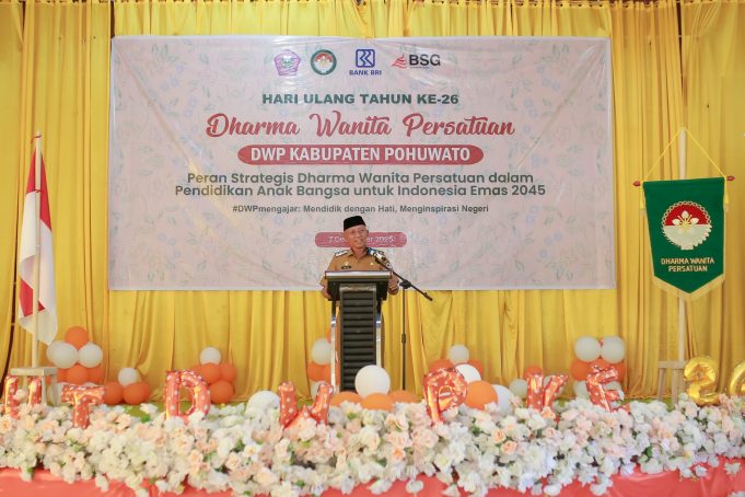 POHUWATO (barometernewsgo.com)- Menghadiri peringatan Hari Ulang Tahun (HUT) Dharma Wanita Persatuan (DWP) ke-26 Tingkat Kabupaten Pohuwato, Wakil Bupati Iwan S. Adam menyampaikan pesan-pesan bijak untuk anggota Dharma Wanita yang memadati Gedung Panua Kantor Bupati Pohuwato, Senin (8/12).