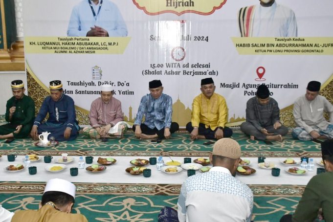 POHUWATO (barometernewsgo.com)-Pemerintah Daerah Kabupaten Pohuwato bersama Lembaga Adat menggelar perayaan Hari Asyura (10 Muharram) 1446 H yang berlangsung di Masjid Agung Baiturrahim, Senin, (15/07/2024).